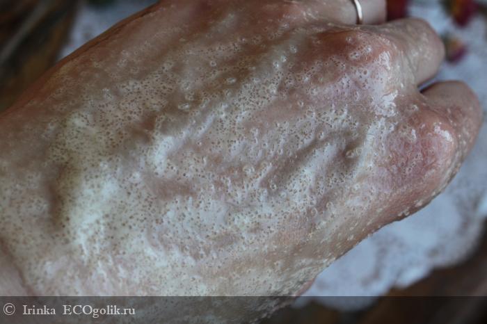При соприконосвении с водой скраб очень активно эмульгирует, превращаясь в молочко.