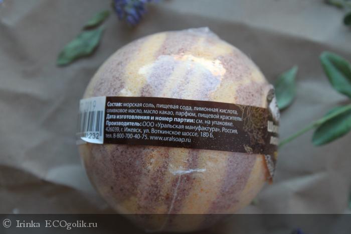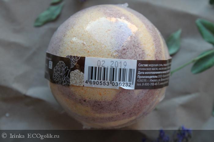 В состав бурлящего шара входит морская соль, пищевая сода, лимонная кислота, оливковое масло, масло какао, парфюм, пищевой краситель.