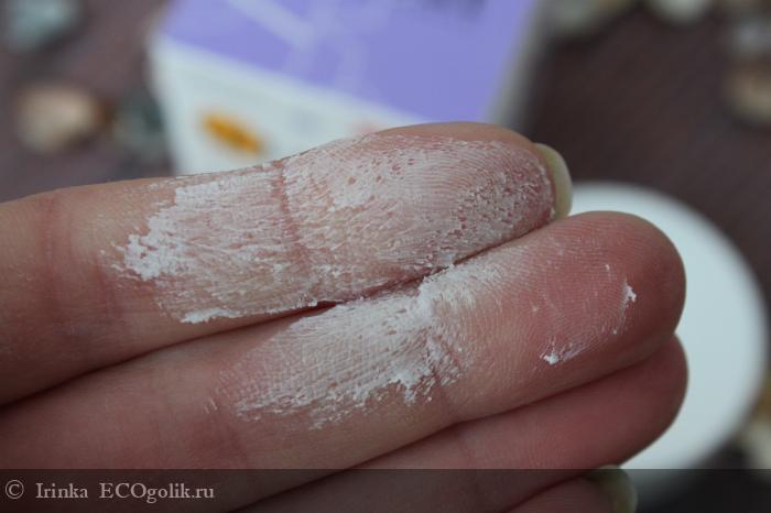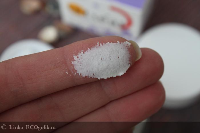 В состав входит кукурузный крахмал, масло ши и масло кокоса, сода и цинк, витамина Е и F.