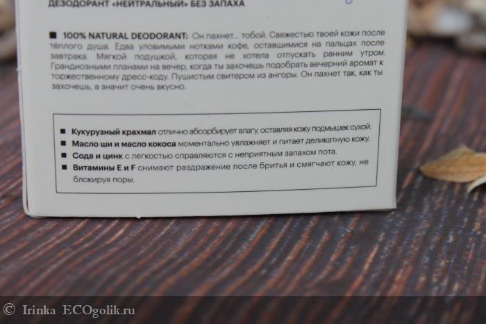 С обратной стороны коробки представлена подробная информация о самом средстве, а также о составе. При использовании дезодоранта "Нейтральный" вы будете пахнуть собой, будет ощущаться свежесть кожи после теплого душа