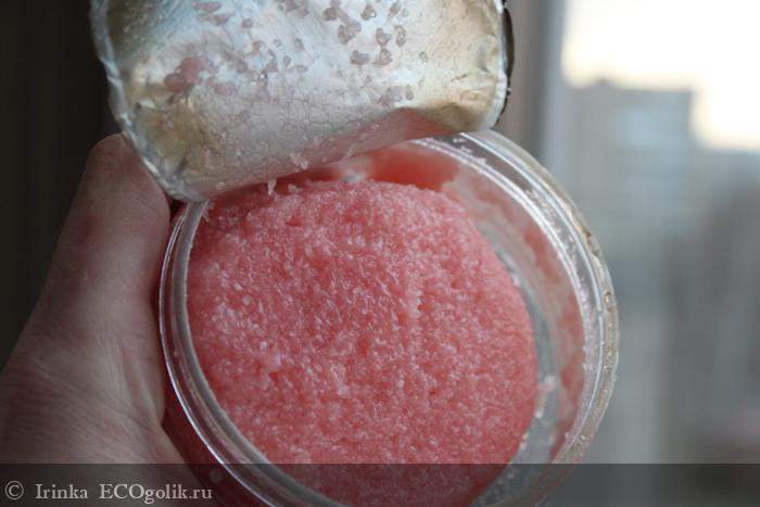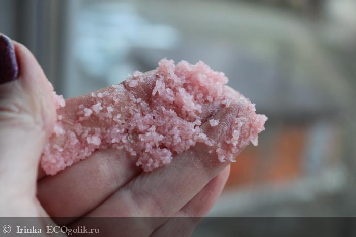 Сам скраб нежно-розового цвета, аромат не насыщенный, спокойный, хорошо ощущаются нотки кедра.