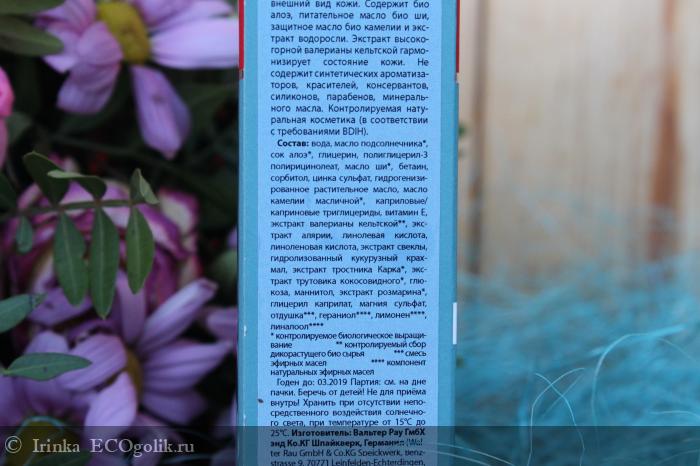 В состав включены био алоэ, питательное масло био ши, защитное масло био камелии и экстракт водоросли.