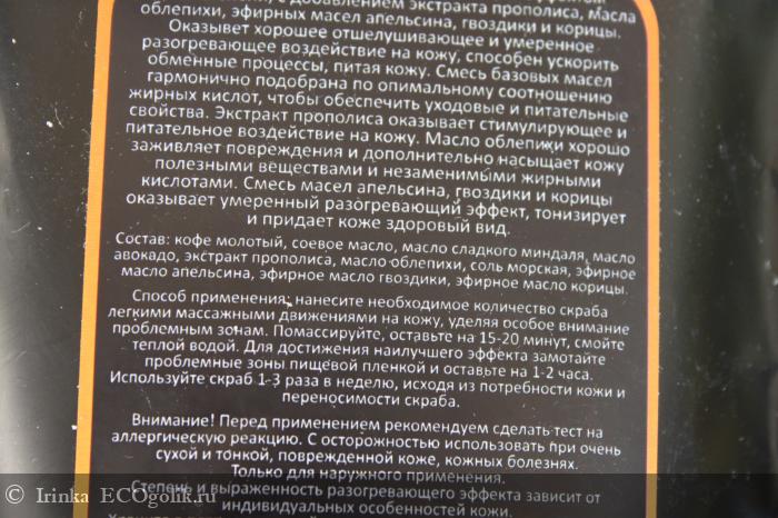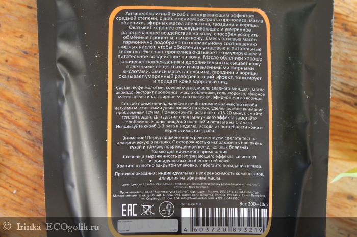 В состав входит кофе молотый, соевое масло, масло сладкого миндаля, масло авокадо, экстракт прополиса, масло облепихи, соль морская, эфирное масло апельсина, эфирное масло гвоздики, эфирное масло корицы.