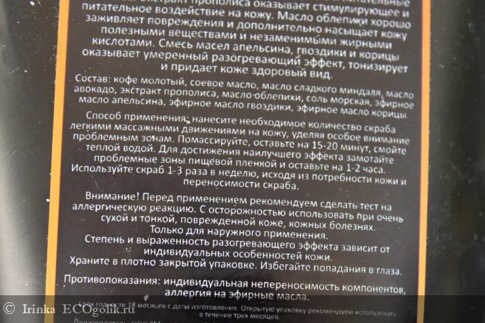 . Скрабирующие частицы хорошо ощущаются, они не травмируют кожу. Если использовать скраб просто как скраб, не оставляя на теле, то я не ощущаю разогревающего эффекта. А если нанести, как советует производитель, и оставить на 15-20 минут, то спустя 5 минут начинает ощущаться легкое, комфортно жжение. После смывания скраба кожа была немного покрасневшей. Я выдержала минут 10, на дольше меня не хватило