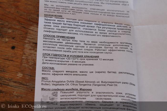 После его использования кожа становится увлажненной. Для меня заметны питающие свойства средства, баттер разглаживает кожу, действительно, делает ее более упругой и эластичной и способствует уменьшению признаков целлюлита (конечно, не забываем о питании, питьевом режиме и физической активности). После применения баттера не ощущается липкости, а увлажнения хватает надолго.