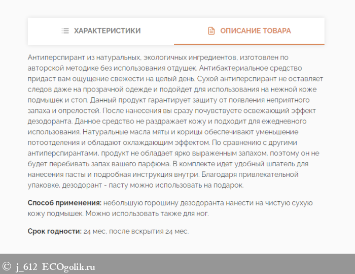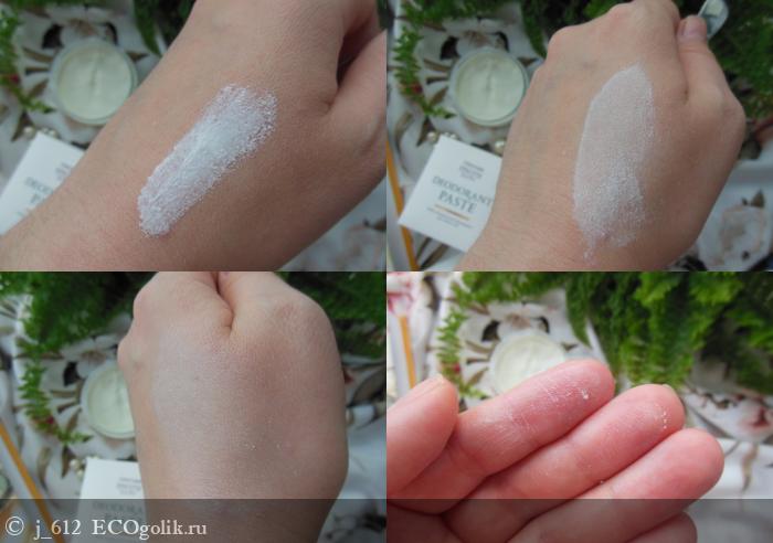 После нанесения пасты некоторое время ощущается холодок - действие ментола, но спустя пару минут всё проходит. Смахнув остатки пасты можно одеваться. Единственное, хочу отметить, что на тёмном паста может немного "отпечатываться" при процессе потоотделения. Запаха пота действительно не наблюдается в течение дня, даже к вечеру совершенно свежо. На потоотделение, как я уже писала выше, дезодорант не может повлиять, так как он не блокирует потовые железы.