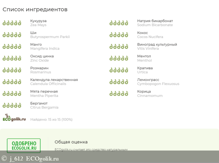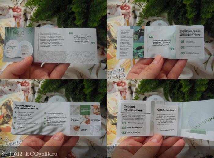 Состав дезодоранта-пасты (взят с официального сайта бренда): крахмал кукурузный, пищевая сода, масла ши, кокоса, манго, виноградной косточки, оксид цинка, ментол, СО2 — экстракты розмарина, крапивы, календулы, эфирные масла лемонграсса, мяты, корицы и бергамота.