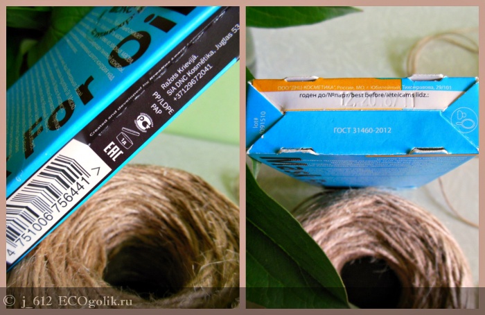 У коробочки есть "ножки", которые позволяют более-менее устойчиво принимать вертикальное положение без дополнительной опоры. На дне содержится информация о дате годности (в моем случае - декабрь 2018 года).