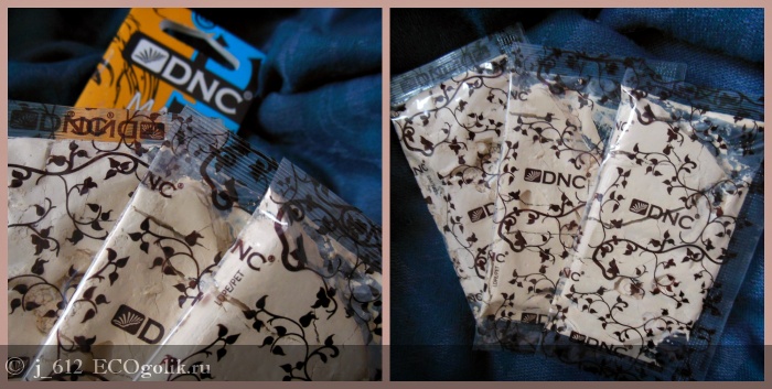 На каждом пакетике есть логотипы DNC, ну плюс по всему контуру имеется мелкий "веточно-листиковый" узор (старое оформление, которое мне нравится гораздо больше нового - там веточки намного крупнее, что делает оформление менее изящным).