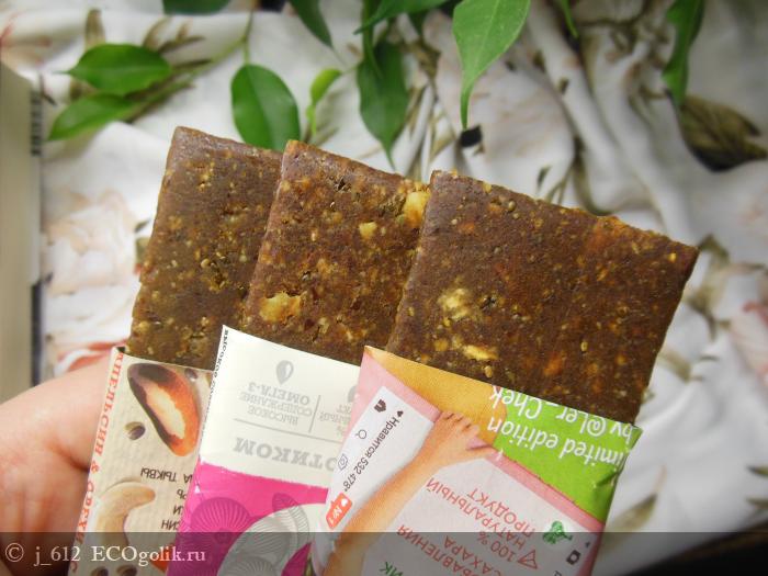 Честно говоря, увидев в названии клюкву, подумала, что батончик будет кисленький, но нет, он с естественной фруктовой сладостью, но более со свежим что ли привкусом. Здесь ярче слышатся орехи в составе, и не только слышатся, но и хрустятся. Вкусно, к зубам не липнет, сочетание очень интересное и мне понравилось больше, чем батончик №1.