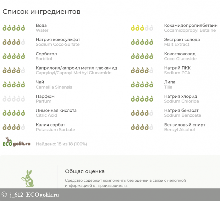 Состав геля для умывания (взят с официального сайта бренда): Aqua (Вода), Cocamidopropyl Betaine (ПАВ из кокосового масла), Sodium Coco-Sulfate (ПАВ из кокосового / пальмового масла, сертификат ECOSERT, разрешенный по стандарту COSMOS для производства органической косметики), Malt Extract (Экстракт ячменного солода), Sorbitol (Сорбитол / увлажнитель), Coco-Glucoside (ПАВ из кокосового масла и глюкозы), Capryloyl/Caproyl Methyl Glucamide (ПАВ на основе глюкозы и кокосового масла), Sodium PCA (Пироглутамат натрия, NMF / натуральный увлажняющий фактор кожи), Camellia Sinensis Leaf Water (Гидролат зеленого чая), Tilia Vulgaris Flower Water (Гидролат липы), Parfum (Отдушка), Sodium Chloride (Соль пищевая), Citric Acid (Лимонная кислота / регулятор показателя pH), Sodium Benzoate, Potassium Sorbate, Benzyl Alcohol (Бензоат натрия, Калия сорбат, Бензиловый спирт / консервант, разрешенный по стандарту COSMOS для производства органической косметики).