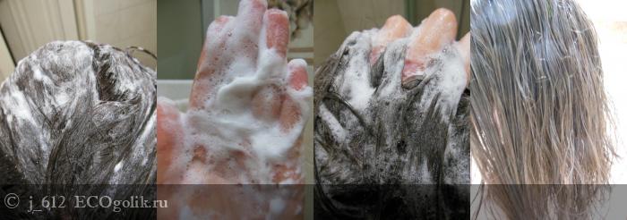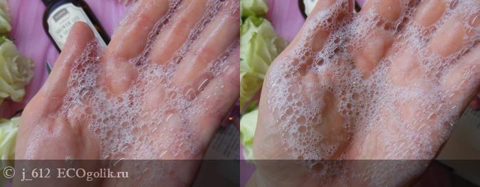 Стоит отметить, что перед использованием рекомендуется флакончик с гель-шампунем предварительно встряхнуть. При намыливании образуется воздушная, нежная пена, и прямо в считанные секунды. Шампунь хорошо проникает вглубь, промывая не только локоны, но и очищая кожу головы. Пены достаточно и для мытья волос, и для тела (даже побрить ноги можно умудриться, если требуется). Смывается/выполаскивается хорошо, без каких-либо затруднений. После подсушивания, если не использовать дополнительные средства для волос - маски, бальзамы, кондиционер, то на ощупь волосы будут несколько жестковаты. Для меня это вполне приемлемо, с этим шампунем могу себе позволить обойтись без кондиционера.