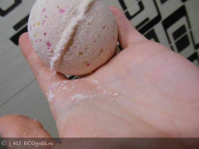 Гейзер представляет собой довольно большой шар, он не белый, немного с желтизной, усыпан многочисленными разноцветными вкраплениями (желтые, ярко и бледно розовые). У меня дочь - розовые пятнышки сразу же завоевали ее внимание. Аромат не резкий, приятный, ванильные ноты, но очень развеяно. При разворачивании шар немного осыпается.