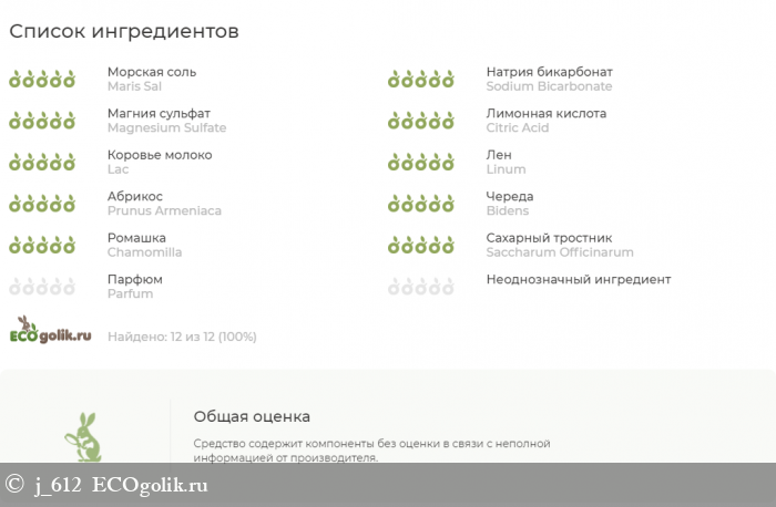 Состав (взят с официального сайта бренда): Sea Salt (соль морская), Sodium Bicarbonate (сода), Magnesium Sulfate (соль сульфат магния), Citric Acid (лимонная кислота), Milk Powder (молоко), Linseed Oil (масло семян льна), Prunus Armeniaca (Apricot) Oil (масло абрикоса), Bidens Tripartita (череды) Extract, Chamomilla Recutita (ромашки) Extract, Sugar, Fragrance, Color.