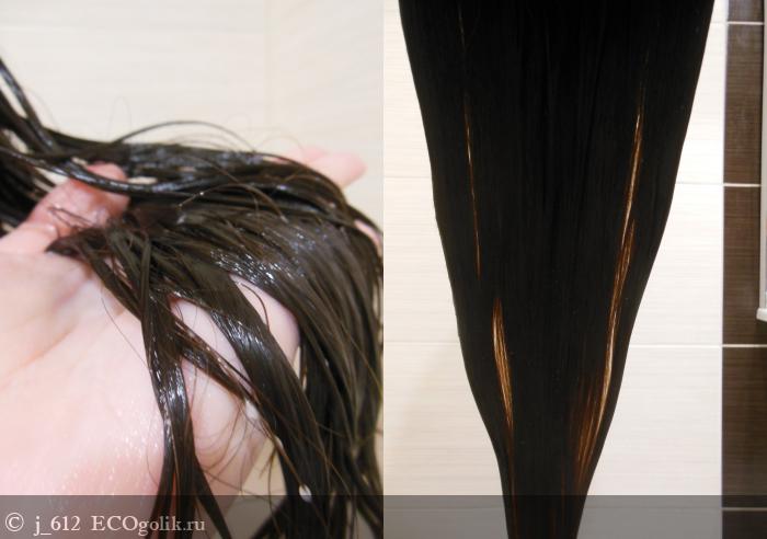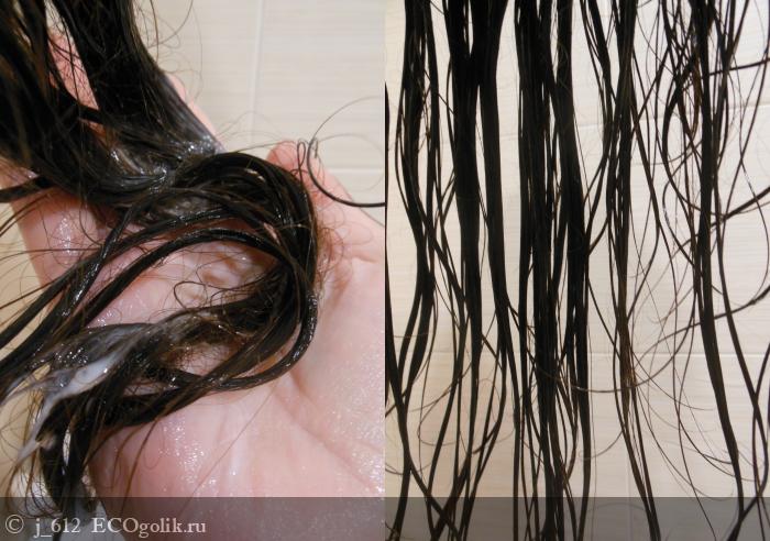 Смываю лейкой душа в течении нескольких минут, пока тактильно не буду чувствовать скользящей гладкости. За это время, точнее во время этой процедуры, отмечается послушность локонов и распутывание калтунов, "эффект мочалки" смягчается, сглаживается.