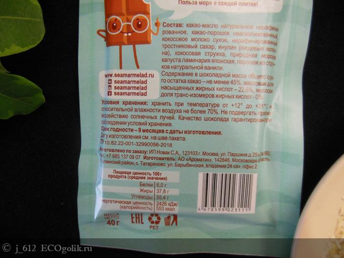 Магазинный шоколад очень далек от плиточек натурального сегмента, я это прекрасно знаю. И сужу морской шоколад "Молочный с кокосом" Sea Marmelad по своим личным вкусовым ощущениям. Для меня эта шоколадка оставила больше замешательства и разочарования, чем удовольствия и радости.
