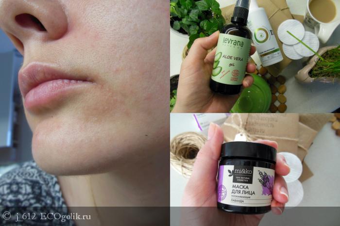 Я бегом смывать в ванну. Облегчения сильного не оказалось. В зеркале - о, ужас - лицо в ярко красных пятнах, в большом количестве как раз вокруг рта и носа. Решила сбрызнуть гидролатом, чтобы хоть чуть-чуть успокоить кожу. Толку тоже особо никакого. В итоге остановилась на алоэ Levrana с последующим использованием маски МиКо.