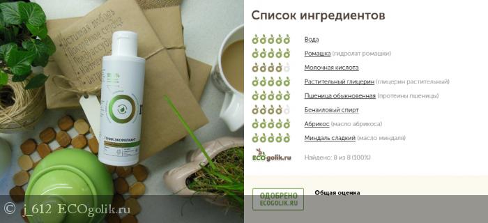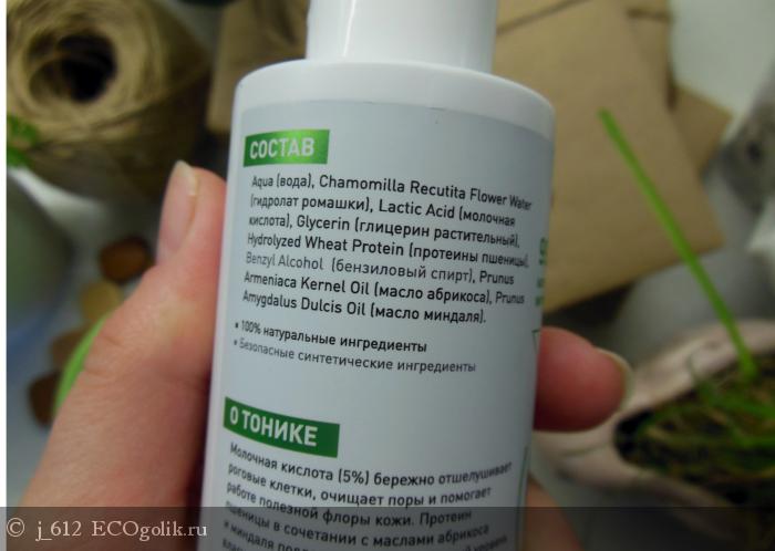 Молочная кислота (5%) бережно отшелушивает роговые клетки, очищает поры и помогает работе полезной флоры кожи. Протеин пшеницы в сочетании с маслами абрикоса и миндаля поддерживает оптимальный уровень влаги. А гидролат ромашки блокирует размножение бактерий.