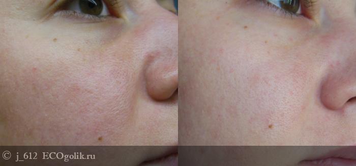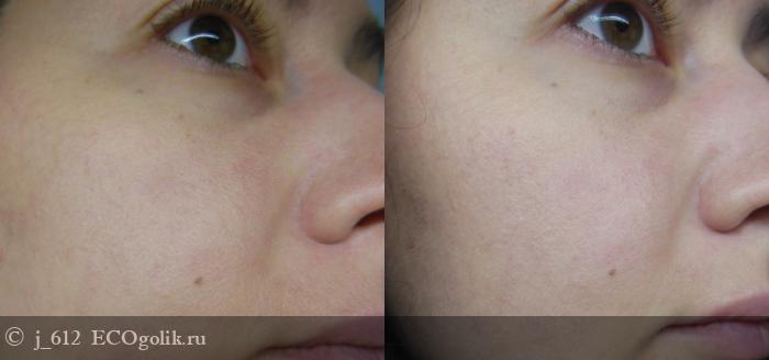 Легкое скольжение при нанесении и кожа сразу преображается. Впитывание быстрое, без маслянистого эффекта после нанесения. Кожа после флюида увлажненная, напитанная, улучшается цвет лица, словно такое сияние, тактильно приятная, нежная, бархатистая. На фото ниже заметно, что после нанесения флюида кожа не такая стянутая, да и тон лица более ровнее.