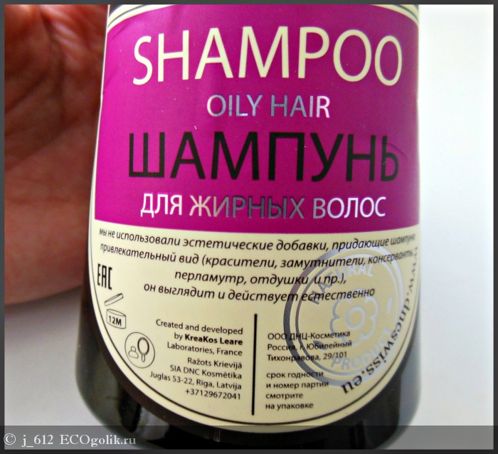 Упаковка шампуньки представляет собой картонный коробок с фиолетовой (отличительной) полосой на лицевой стороне с надписью - ШАМПУНЬ ДЛЯ ЖИРНЫХ ВОЛОС. Такая же надпись имеется на верхней части коробки (фото ниже).