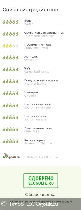 В состав продукта входят вода очищенная, экстракт одуванчика, пропиленгликоль, экстракт артишока, экстракт зеленого чая, гиалуроновая кислота, глицерин, левулинат натрия, анисат натрия, лимонная кислота, хлорид калия.