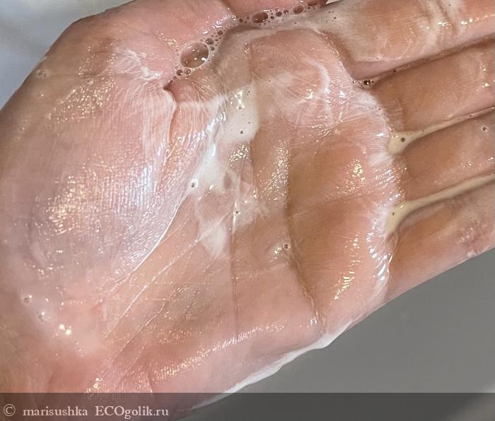 Текстура довольно текучая, и легко вспенивается в нежную кремвую пену. Она не пышная, как у пенок с помпами, а как будто бы эмульсия.