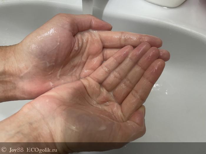 Что интересно, так это то, что в описании продукта слово «пенка» прямо большими буквами написано, а в способе применения указано, что продукт необходимо вспенить в ладонях.