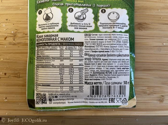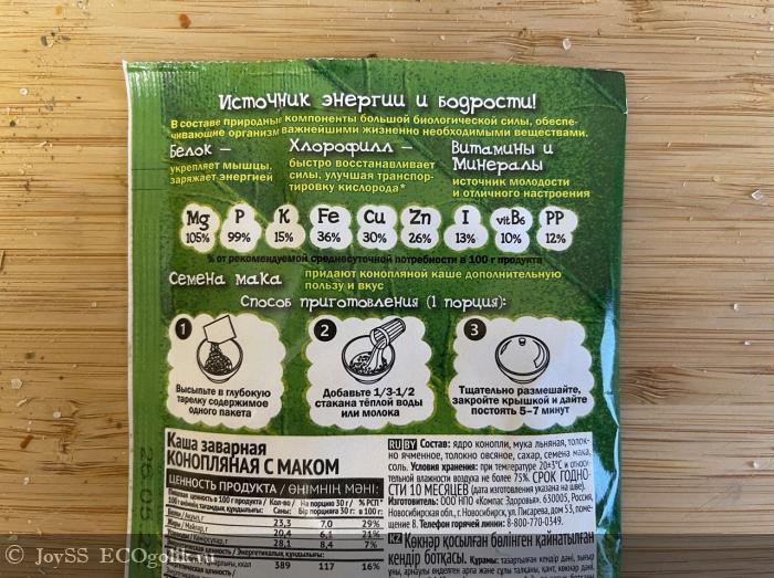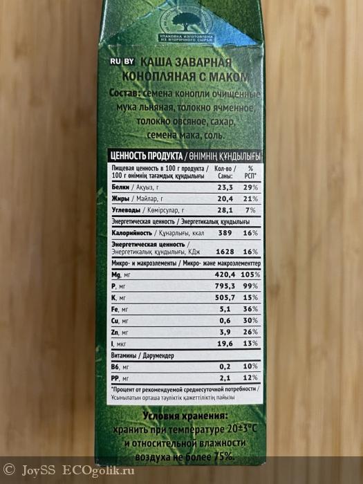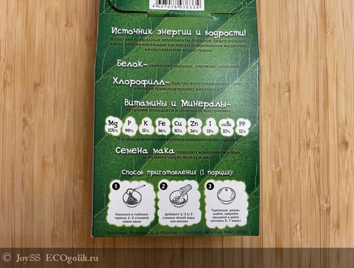 В этой каше меня привлёк состав! В нём содержатся ядро конопли, мука льняная, толокно ячменное, толокно овсяное, сахар, семена мака, соль.