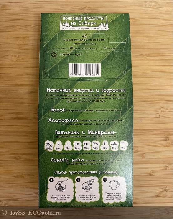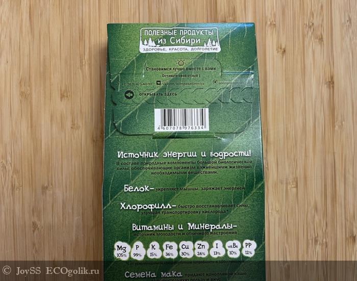 В составе меня привлекло наличие хлорофилла, который способен быстро восстанавливать силы, улучшая транспортировку кислорода; хорошие показатели по содержанию белка, который укрепляет мышцы и заряжает энергией (на порцию 30 грамм – 7 грамм белка!); содержание разнообразных витаминов и минералов, а также такой простой, но в то же время интересный ингредиент, как семена мака, которые с одной стороны являются составляющей вкуса продукта, а с другой стороны сами по себе содержат полезные и питательные вещества