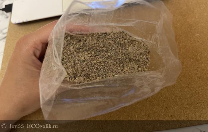 Текстура очень интересная – не знаю, хорошо ли будет видно на фотографиях – это порошок, в котором отдельно можно увидеть ядра конопли и семена мака.