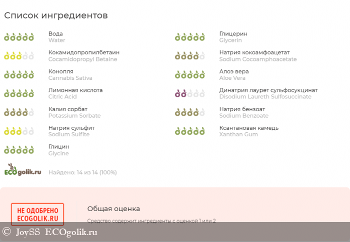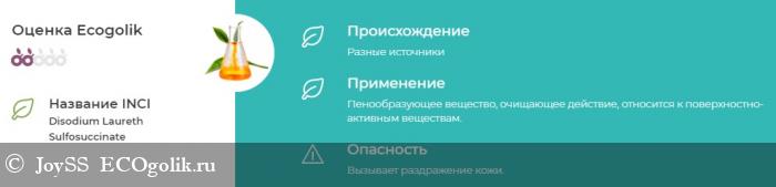 Сразу скажу, что база Экоголика не одобряет состав полностью и один из используемых ПАВ (Disodium Laureth Sulfosuccinate) получает неудовлетворительную оценку в 2 яблочка и определяется базой в качестве критичного.