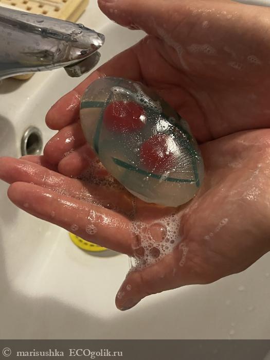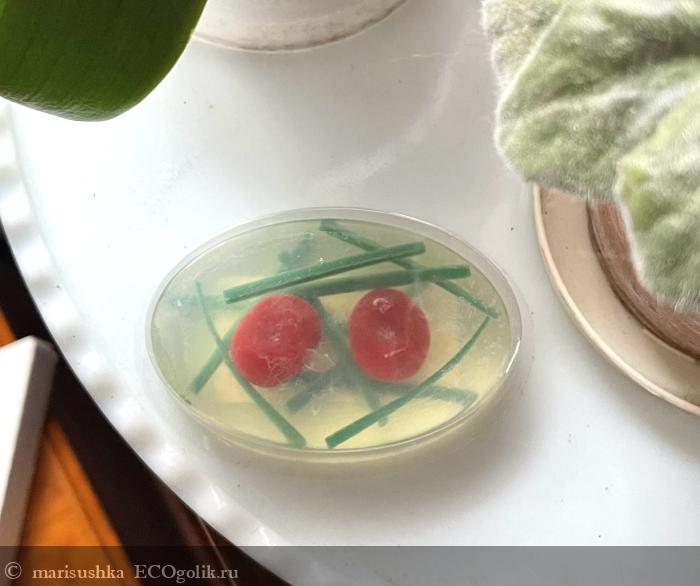 Какое же мыло красивое и необычное! Кажется, что держишь в руках полупрозрачный леденец, внутри которого "запечатана" вкусная начинка - две соблазнительные вишенки, а также зелёные "ломтики" листочков.