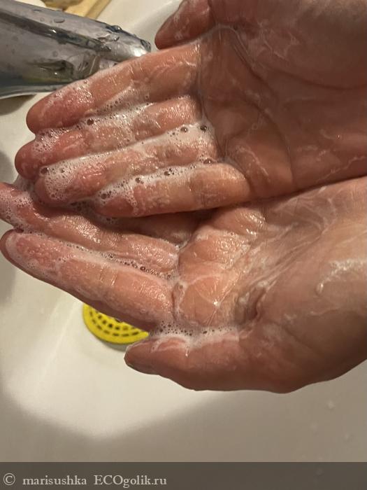 Кожу действительно очищает деликатно. Я использовала для рук, и, соответственно, довольно часто в течение дня мы с ним "встречались". Кожа у меня склонна к сухости + сейчас уже наступили холода. С мылом не возникло никаких проблем, и кожа после использования не сухая, не стянутая, не раздражённая. Очищение действительно получается качественным и при этом бережным и мягким.