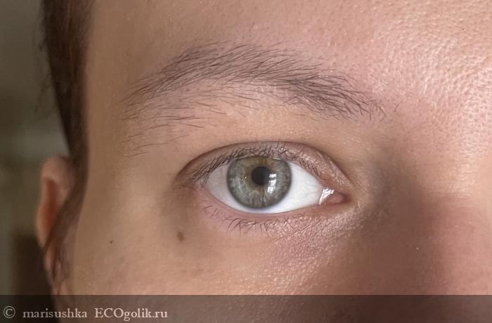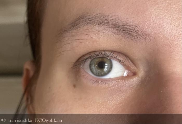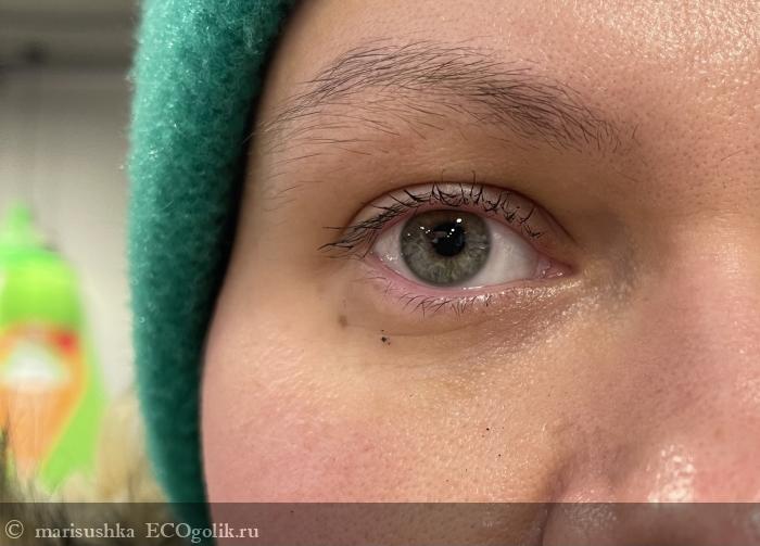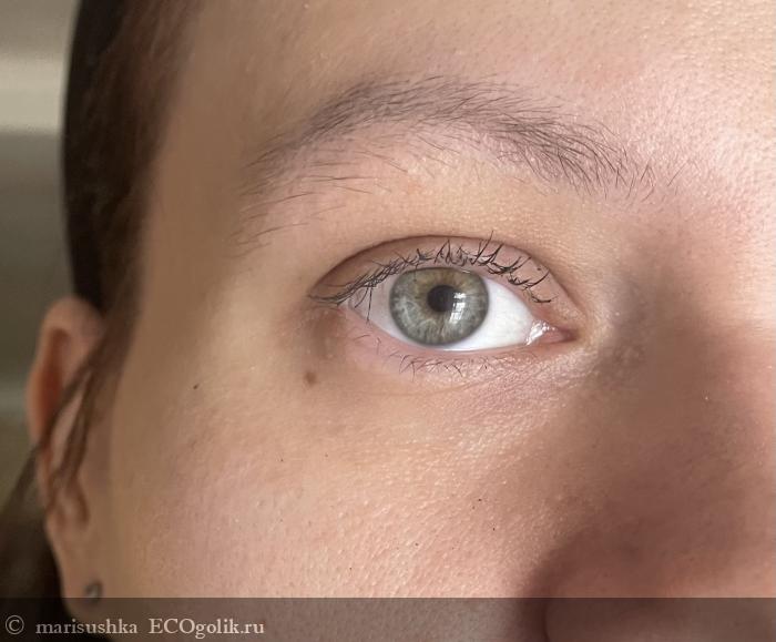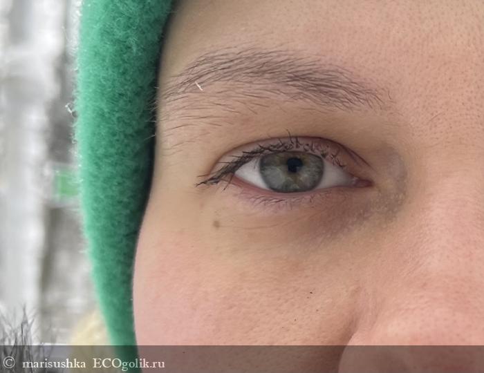 Через час ➡️ несколько крошек туши, которые осыпались ещё в момент нанесения, так и остались, а вот от снега появилась только одна действительно заметная крошка, что, на мой взгляд, очень хороший результат для туши в целом, а для туши с натуральным составом на водной основе — это вообще отличный результат!