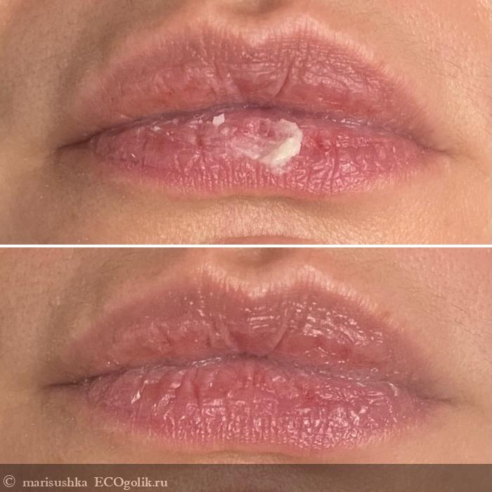 Бальзам хорошо смягчает, питает, обволакивает кожу заботой и уходом, защищает. В особенности понравилось то, что на губах держится очень долгое время, и когда уходит именно влажный визуальный эффект, бальзам всё равно продолжает оставаться на губах — в общем, товарищ не из испаряющихся. После полного исчезновения/стирания нет такого, что губы как будто вырвались из-под плёнки. Я тут как-то купила ланолиновый бальзам для губ и пожалела — вот там губы как в «парилке» всё время, пока бальзам на губах.