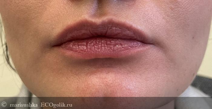 В итоге губы красиво обрамляются лёгкой полупрозрачной розовой вуалью, которая смотрится благородно и элегантно, и вроде бы цвет есть, но при этом точно и не скажешь, есть он или нет.