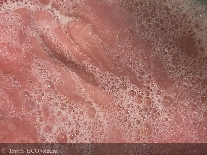 При контакте с водой и вспенивании получается очень приятная и довольно пушистая пенка. Она обволакивает кожу, и её можно растягивать. Это очень классный эффект, потому что сначала мне казалось, что придётся высыпать очень большое количество пудры, чтобы её хватало для использования на всё тело, но в итоге оказалось, что это не так, потому что с помощью пенки получается распределять продукт и массировать кожу даже, пожалуй, лучше, чем, например, сахарным скрабом