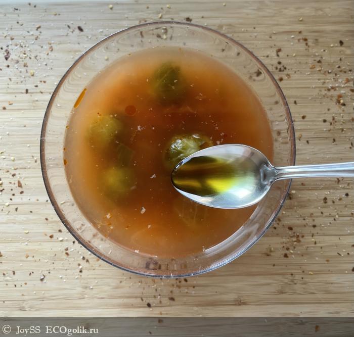 Дозатор, к сожалению, подвёл. Уже не помню, но мне кажется, что первая ложка, которая будет ниже на фотографии, вылилась ровно, то есть аккуратными капельками, бегущими друг за другом, но потом дозатор стал вести себя по-разному. То было такое, что переворачиваешь, а ничего не капает и приходится трясти бутылочку, чтобы в моменте рывка из дозатора выскочила капелька, а сегодня перевернула и оно стало ровно капать, хотя все предыдущие до этого разы капало именно рывками. Я бы, наверное, предпочла, чтобы либо было просто обычное отверстие, либо чтобы четыре отверстия в крестовине были побольше, чтобы масло в них не застревало.