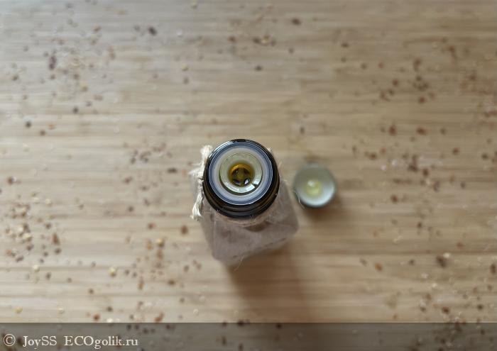 У меня масло в формате бутылочки на 100 мл. Сверху имеется закручивающаяся крышечка с разрывным кольцом, которое служит в качестве защиты от вскрытия. Бутылочка из стекла (GL-71), а вот крышечка, наверное, из алюминия. Также бутылочка обёрнута крафтовой бумагой, которая у верха бутылочки фиксируется джутовой верёвочкой. Выглядит всё это очень красиво, но, правда, в процессе использования бумага пропитывается маслом, и, соответственно, верёвочка тоже, и так как с них масло полностью не стереть, то каждый раз пачкаешься немного об эти части, а ещё пропитавшаяся маслом джутовая верёвочка так и норовит попасть прямо в капельный дозатор своими размохрившимися «усиками». Я бумагу с верёвочкой думаю всё-таки снять, так как стеклянную бутылку легче полностью протереть от накапавшего на неё масла.