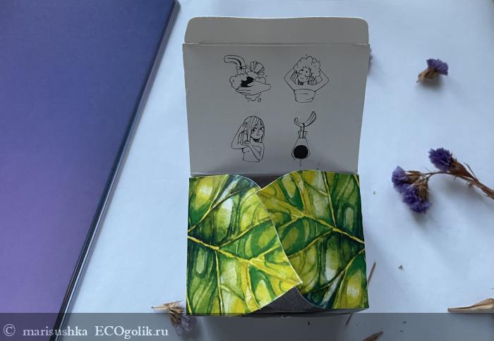 Ещё когда только первый раз попробовала другой твёрдый шампунь у бренда, влюбилась в упаковку. За сочными красивыми листочками прячется мешочек-сеточка, а внутри - шампунь.