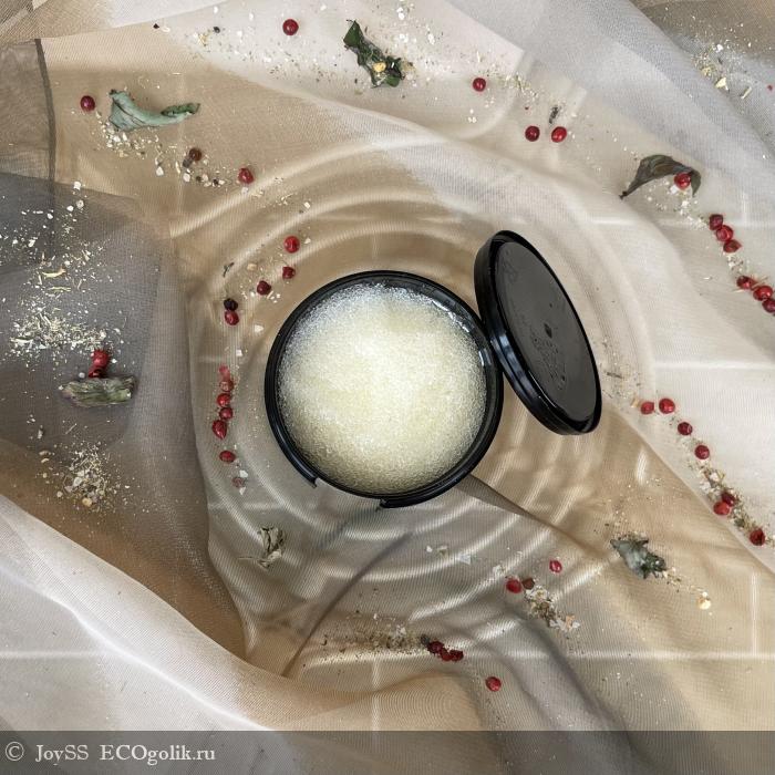 Ещё мне не очень понравилась консистенция. На фотографиях выглядит, как обычный сахарный скраб, а на деле . . . представьте, что вы приготовили манную кашу, но сразу её не съели. Она постояла какое-то время, и вот вы решили её съесть, но она не жидкая, а как бы отделяется целыми блоками. Вот и здесь также – пытаешься взять продукт, а он как бы немного дубовый и сначала не поддаётся, и получается, что отделяешь сахарные блоки, как в манной каше. Я как-то привыкла к тому, что у сахарных скрабов хоть и тягучая, но более гибкая текстура