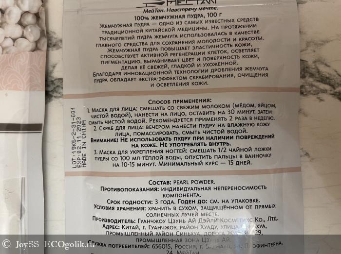 – к тому, что с таким продуктом, как жемчужная пудра, я знакома очень давно, и когда сама решила им пользоваться, то даже не искала другого производителя, а стала покупать её у MeiTan, потому что эту пудру мы всегда покупали именно там, но однажды так оказалось, что магазин переехал, а в Питере с его расстояниями съездить в другой – это не самый удобный вариант, а заказать на сайте – тоже неудобно, потому что кроме пудры мне там ничего не нужно, так как у бренда ненатуральная косметика, и я решила поискать аналоги. Нашла, но в разы дороже, что мне не понравилось, ведь я знаю, какова на самом деле стоимость одного пакетика, а в каких-то аналогах вообще был странный состав – кроме самой пудры ещё какие-то добавки, и это мне, конечно же, тоже не понравилось, ведь хотелось бы в составе видеть только один компонент – измельчённый в пудру жемчуг. Самое смешное – это то, что я попросила маму сходить в магазин этого производителя в нашем родном городе, потому что там получится ближе, чем здесь