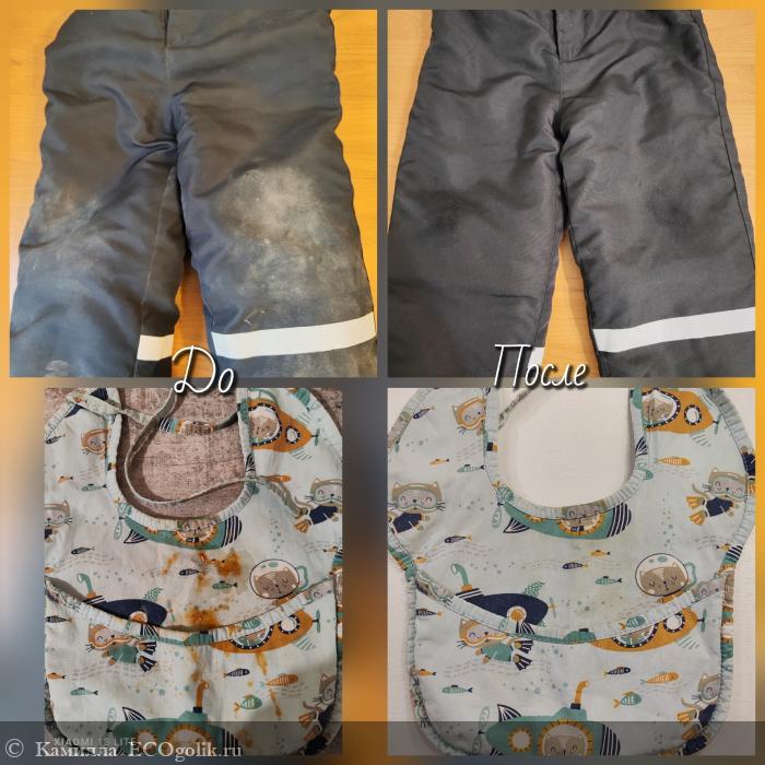 Отстирывающая способность: в качестве примера сфотографировала уличные штаны ребенка (в грязи и песке) и слюнявчик с котами-водолазами (зато самостоятельно ест