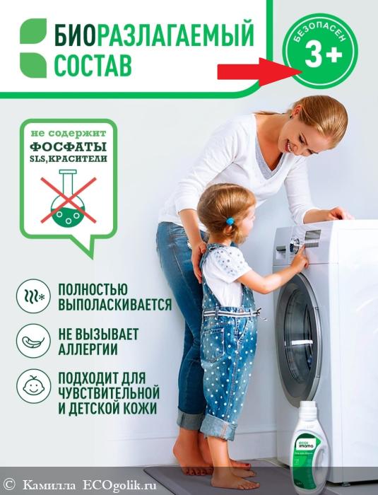 "Гипоаллергенный состав не вызывает раздражения и способен справиться со сложными загрязнениями. Комплекс энзимов эффективно удаляет сложные пятна даже с белого детского белья. Жидкий гель для стирки Ecomama деликатное средство, в нем отсутствуют фосфаты и красители.