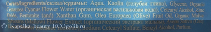 Состав: Вода, голубая глина, Глицерин, Органическая васильковая вода, Цетеариловый спирт, Цинка Оксид, Бентонит и Ксантановая Камедь, Оливковое масло, Органический экстракт мальвы, Овсяное толокно, Цетеариловый сульфат натрия, Бензиловый спирт, Парфюм.