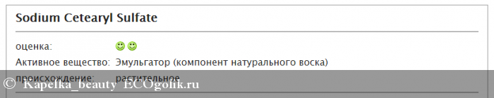 Цетеариловый сульфат натрия (Sodium Cetearyl Sulfate) - анионное ПАВ. Хорошо растворяется в воде. Обладает высокой моющей способностью. В косметике используется в моющих средствах.