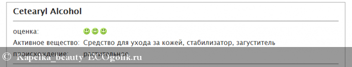 Цетеариловый спирт (Cetearyl alcohol) - Служит загустителем и стабилизатором вязкости системы масло в воде, предотвращает разделение компонентов. Смягчает кожу, стягивает поры, дезинфицирует, удерживает влагу в коже и образует пленку, придает коже бархатистость и шелковистость, облегчает расчесывание волос и их структуру. Применяется в основном в кремах и бальзамах для волос.