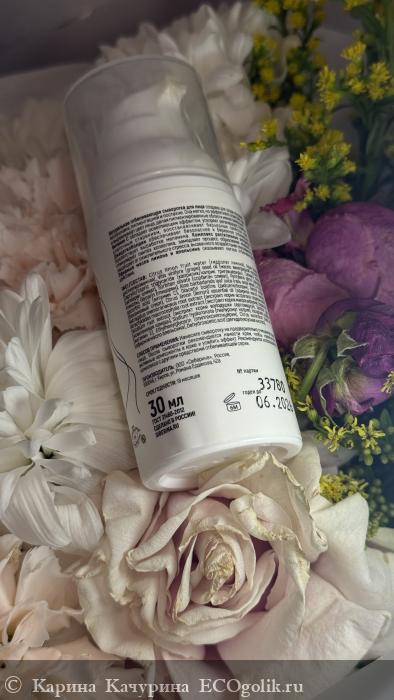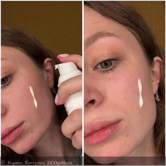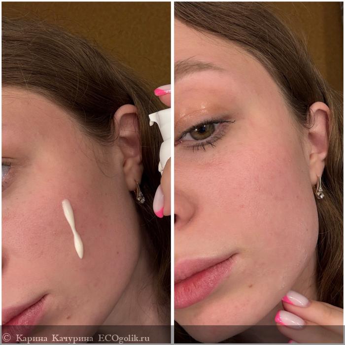 Наносила я сыворотку дважды в день: после очищения лица и до нанесения увлажняющего крема. Она ложится довольно тонким слоем, но если у вас вообще не сухая кожа, то сыворотка справится с питанием и увлажнением, она обладает таким эффектом, хотя он не ключевой в её действии. Сыворотка похожа на какой-то молочный продукт, и очень нежно как сливки распределяется по коже. Буквально один раз провести пальцами, и она отлично впитывается.