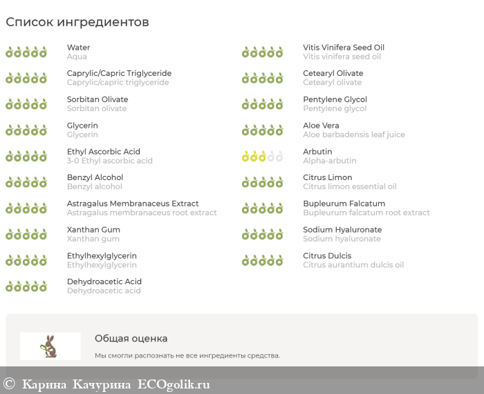 осветляющим эффектом, а также является антиоксидантом; альфа-арбутин, который обеспечивает безопасное и бережное отбеливание, препятствуя выработке пигмента - меланина, различные эфирные масла и растительные экстракты.