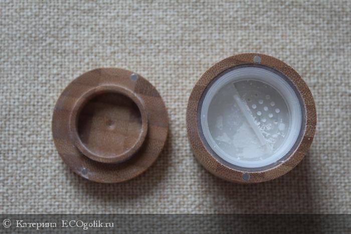 Крышка крепится к коробочке за счет магнитиков, что весьма продуманно. Во-первых, легко открывается - не надо прилагать усилие (из-за этого есть риск частично рассыпать пудру). Во-вторых, это достаточно надежно. При падении бамбуковая крышка не отлетает от коробочки. Было проверено, и не раз